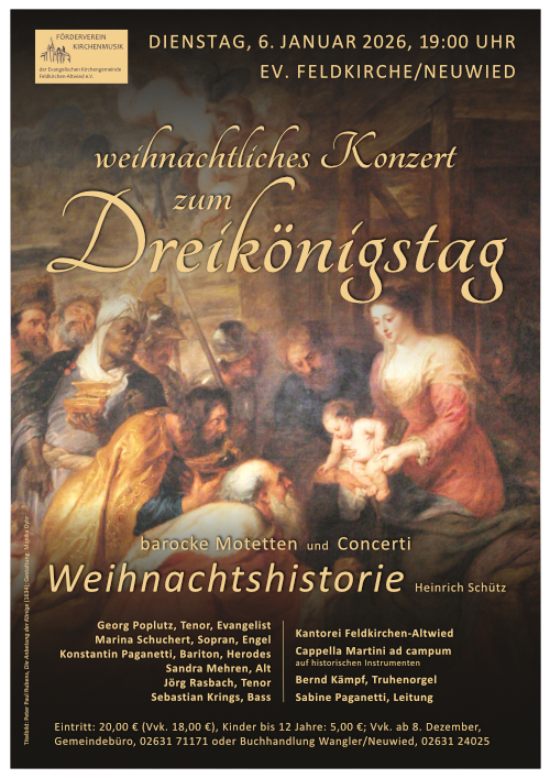 Weihnachtliches Konzert zum Dreikönigstag Festliche Barockmusik in der Evangelischen Feldkirche Zum feierlichen Abschluss der Weihnachtszeit lädt die Evangelische Kirchengemeinde Feldkirchen-Altwied herzlich zu einem besonderen Konzert zum Dreikönigstag ein. Im Mittelpunkt des Abends stehen barocke Motetten und Concerti, darunter die eindrucksvolle Weihnachtshistorie von Heinrich Schütz, ergänzt durch Werke von Georg Philipp Telemann und weiteren Komponisten des…