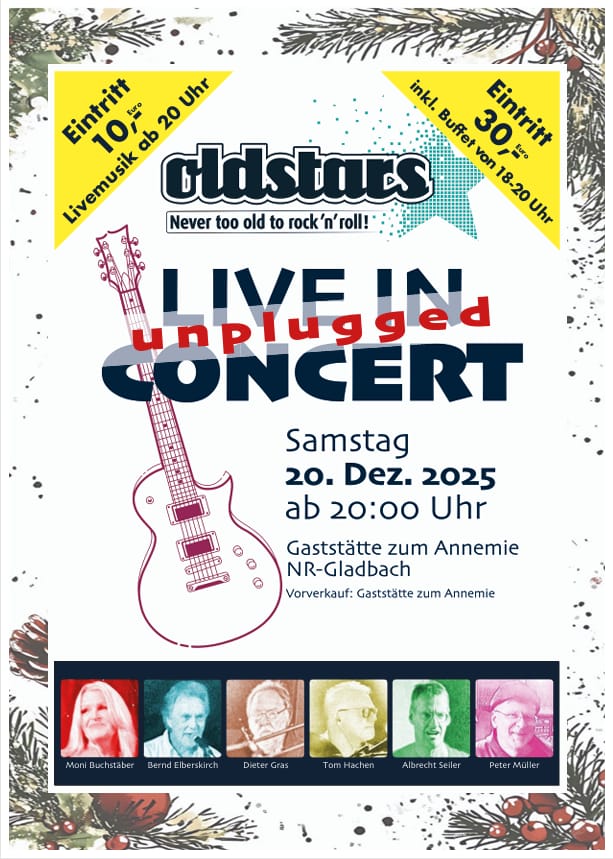 Am Samstag, 20. Dezember 2025, lädt die Band zu einem unplugged Live-Konzert in die Gaststätte zum Annemie in Neukirchen-Vluyn (NR-Gladbach) ein.