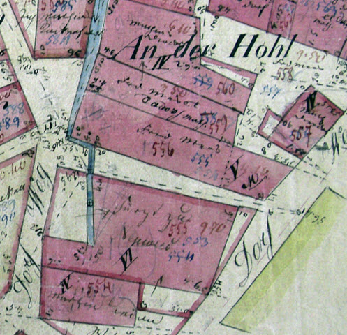 Im unteren Teil die Parzellen VI: Fürst zu Wied (Untere Mühle), sowie direkt nach unten anschließend die Parzelle IV (Backesmännchen-Haus. Eigentümerin zu diesem Zeitpunkt: Bayon Martin, Wittwe)